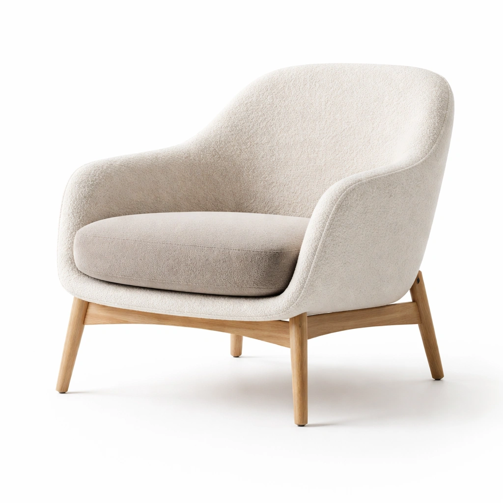 Sillón de tela boucle beige con estructura de madera