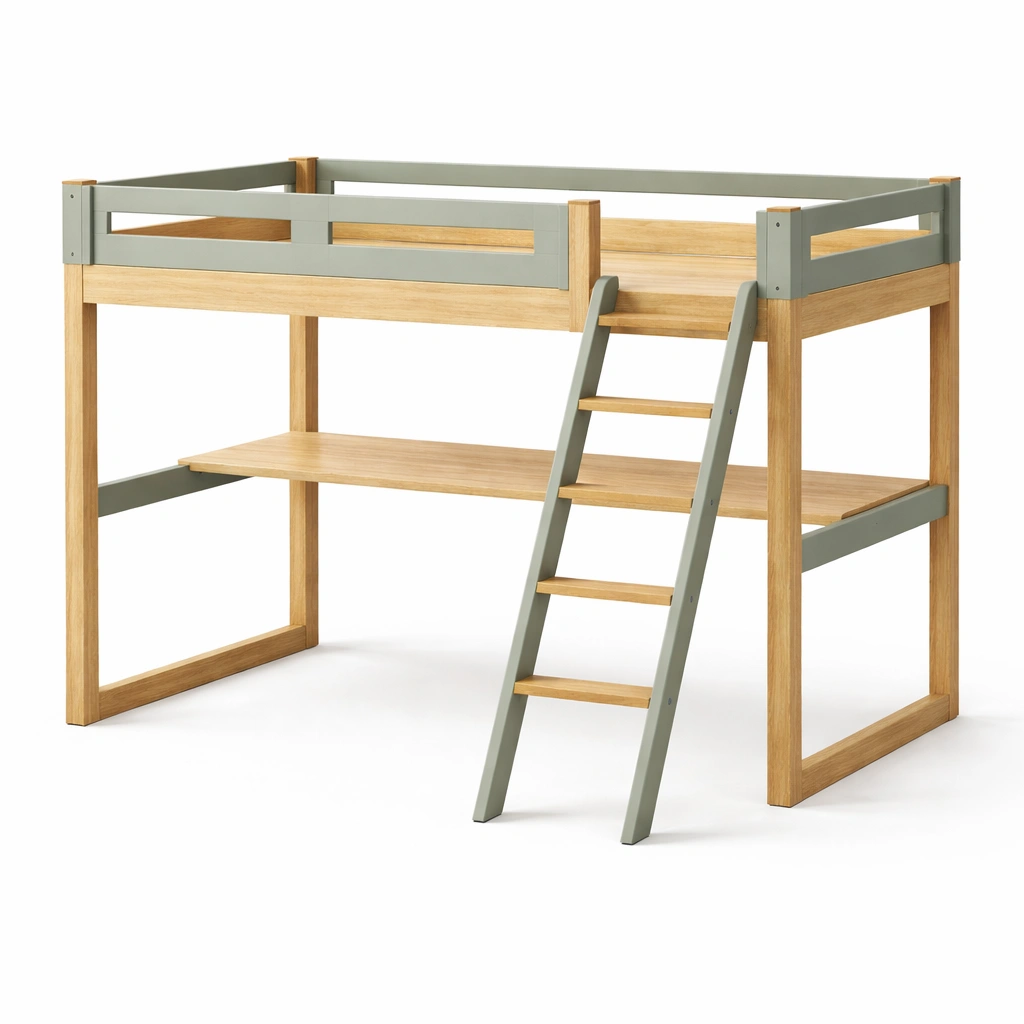 La cama alta está fabricada con madera de pino y metal pintado. Sus dimensiones son 198 cm de longitud, 104 cm de ancho y 120 cm de altura. Viene en colores Natural y Verde. Incluye una escalera en el lado derecho y una barandilla de seguridad completa. Recomendado para niños de 6 a 12 años. El paquete incluye la estructura de la cama, la escalera y el escritorio. Se recomienda limpiar con un paño húmedo.